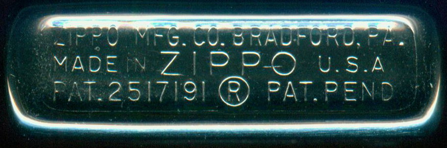 The date coding on Zippo lighters was introduced in late 1955, so lighters made after this date are very easy to identify. Earlier lighters are much more difficult to date accurately. I am going to start with the last undated lighter as this is the easiest to date. This lighter was made between 1953 and 1955 and is identifiable by what is known as the "Full Stamp". The base has three lines of text and is the only uncoded version to carry the Patent Number 2517191. This is followed by the registered trademark sign ® and the abbreviation "PAT.PEND".