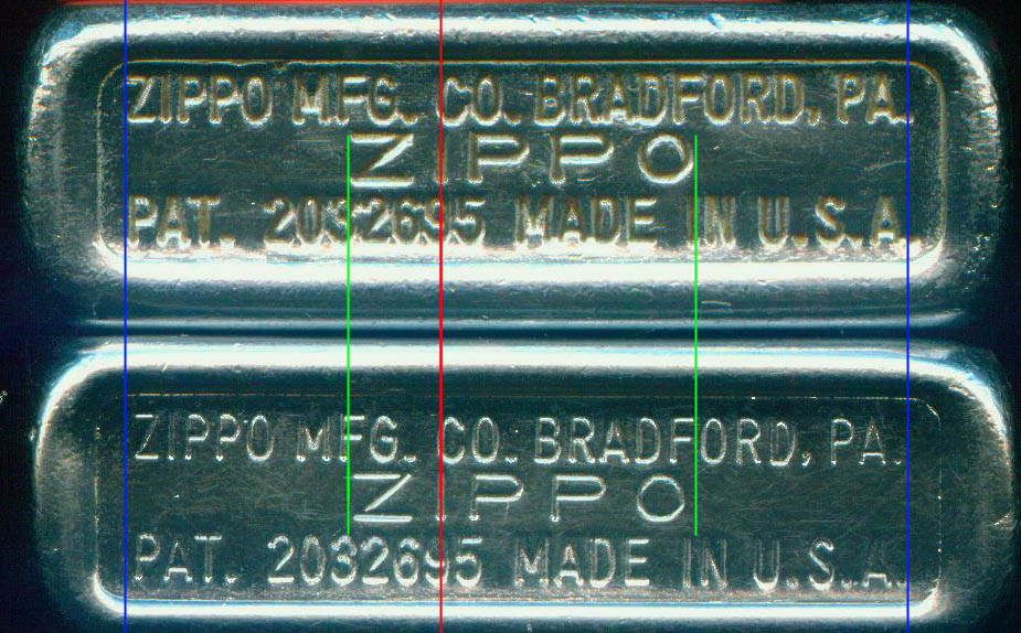 Another detail picture shows just how minor these differences can be. The two lighters below are both 3 barrel (Short Centre) hinged lighters, so can be dated by the hinge to 1946-1949. Again using a red base line through the "I" as a common reference point the two lighters appears identical, however when further lines are added (blue to compare lines 1 & 3, green to compare line 2) we can see that all three lines of text have shrunken very slightly, so, even in this relatively short time-span, two different bottom stamps were in use.