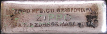 Some lighters in this period had an incorrect patent number. The bottom line reads PAT. #203695. Note the use of the # symbol |