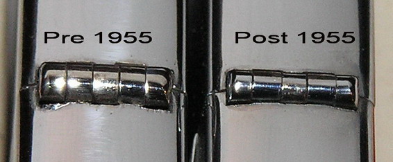 In 1955 the hinge was altered. Prior to this date all five barrels were evenly spaced. In 1955 the barrels were adjusted so that barrel 2 and 4 were slightly larger than barrels 1, 3 and 5. Hinges with equal barrels are generally classed as being manufactured up to the end of 1955, whilst unequal barrels are generally classed as 1956 and later.