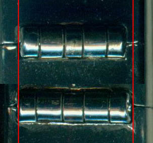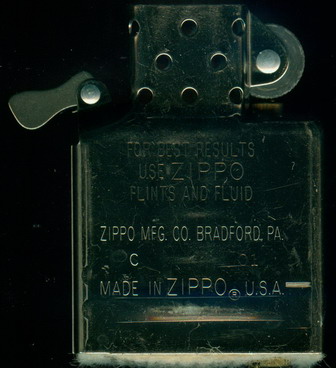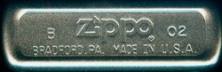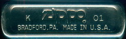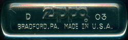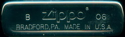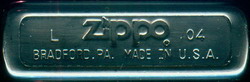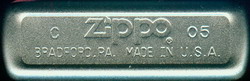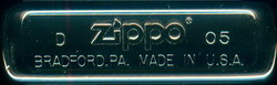 2005 | 05 | There was a slight alteration to the hinge in February. Hinges made from Feb onwards are narrower (see detail). In April 2005 the bottom stamp changed slightly, in that the registered trade mark sign (®) was moved from below Zippo to above it. Some lighters in April were made with the ® at the bottom, and some were made with the ® at the top. Another alteration carried out at the same time was the font used in the bottom line. The easiest way to observe this is to look at the letter "I" in "MADE IN U.S.A. in the earlier version the I has cross lines at the top and bottom whereas in the later version these lines are missing. The spacing between words on the bottom line also altered slightly. It should be noted that the new design was previously used on Zippo lighters made between March and December 2000. |